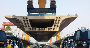 5月13日下午16时,伴随着机器的轰鸣声、鞭炮声、热烈的掌声和欢呼声,900T轮式提梁机将737.6吨箱梁缓缓提起,成