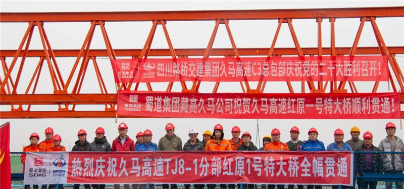 10月16日,党的二十大在北京隆重召开的消息传遍巴蜀大地,给奋战在雪域高原的久马高速建设者带来攻坚克难的力量。17日下午14点,随着最后一片T梁稳稳就位,红原一号特大桥在全体参建人员的不懈努力下顺利实现全幅贯通。