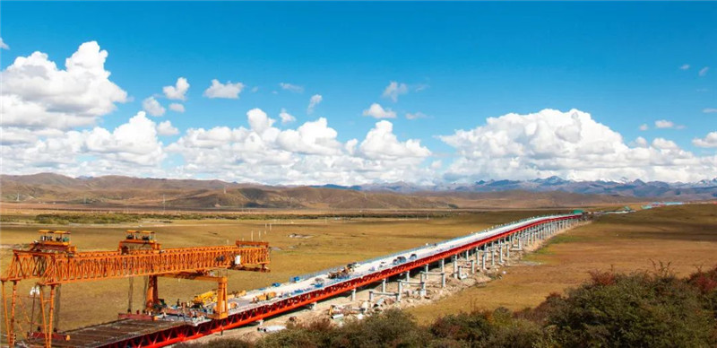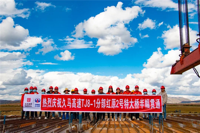 10月4日,在明媚阳光的照射下,久马高速TJ8-1分部红原二号桥半幅贯通。