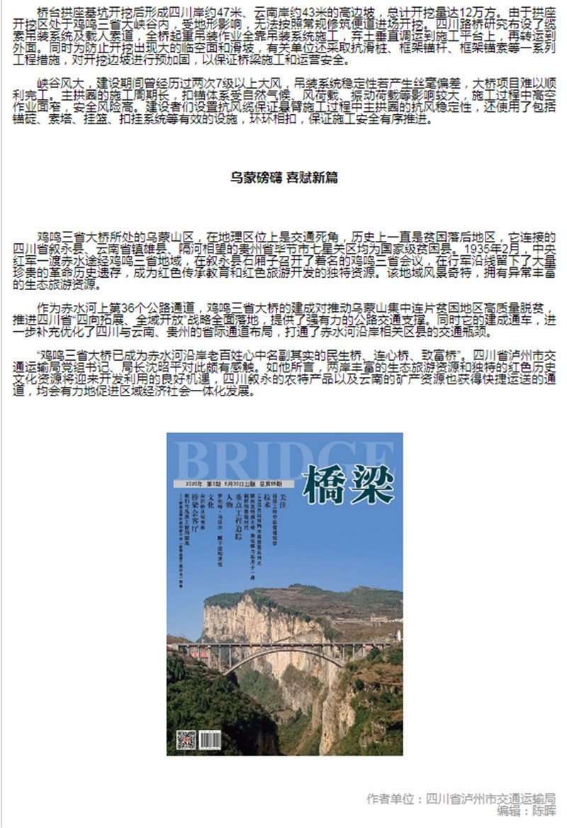 鸡鸣三省大桥喜提《桥梁》杂志封面:飞虹跨幽谷 乌蒙拓通途