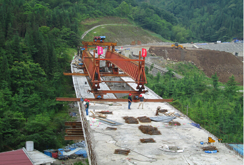 蔡家沟大桥T梁安装前,我部主要管理人员亲临现场组织进行架梁,无论是架桥机安装准备工作,配重、T梁行走的操作过程,还是最后的就位程序都进行详细的计划安排。每个步骤都是经过反复斟酌、商议才进行了最后的实施,为的就是保证整个过程的万无一失。预制T梁架设完毕的那瞬间,在场所有人员悬着的心终于放了下来,阵阵清脆的鞭炮声顿时响起,现场即刻响起了雷鸣般的掌声。
