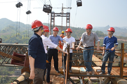 蔡乐军董事长在磨刀溪特大桥钢管拱合龙段与项目技术人员进行交流