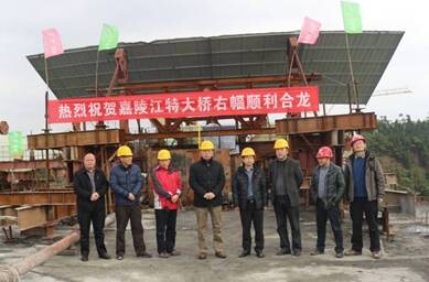 2014年1月6日下午14时,遂广高速武胜嘉陵江特大桥上彩旗飘扬,一派热火朝天的景象。随着最后一方混凝土浇注,由我司遂广高速SG1-4项目施工的武胜嘉陵江特大桥主桥中跨浇注完成,嘉陵江特大桥主桥右幅顺利合龙。这一合龙,标志着遂广高速难度最大、跨度最大、安全风险最高的特大桥控制性工程已被我部顺利攻克,为2015年全线通车赢得了宝贵时间。