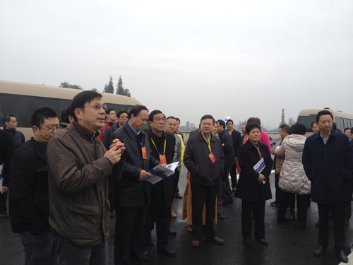成都市副市长刘守成、成都市交委主任胡庆汉、崇州市市委书记赵浩宇、二绕公司副总经理赵斌等领导陪同视察。市交委主任胡庆汉向参观的各级人大代表介绍了成都市的综合交通体系建设情况及成都二绕的建设情况。胡主任介绍道:成都第二绕城高速公路全长223公里(主线),全线6车道,其中在成都市境内160余公里,分为东、西半段建设。成都第二绕城高速公路西段项目位于成都市中心城区和三圈层城市组团之间,路线起于双流县华大路以西,经双流县、新津县、崇州市、温江区、郫县、新都区,止于彭州市濛阳镇,将成都市7个区(市、县)串联起来。二绕西半段路线全长114.22公里,路基宽33.5米,设计时速100公里/小时。该段路将在12月通车。二绕建成后不仅能缓解成都市现有绕城高速公路及环状城市主干线交通压力,分流城市过境交通,还能满足日益增长的客货运输需求。
