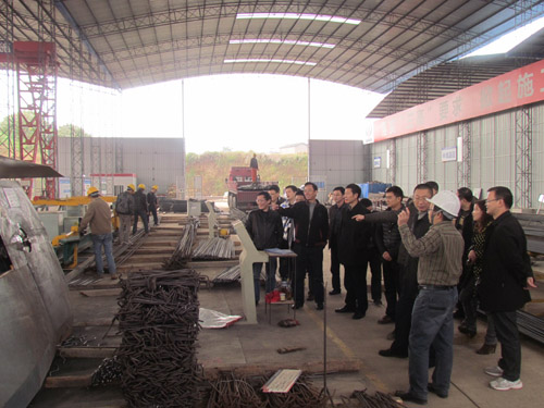 首先他为考察团一行介绍了分部的工程概况,我部工程由1座车站、5座桥、4座隧道和4段区间路基构成。其中宜宾东站为成贵铁路全线重点工程,占地面积557.8亩,按3线7台布置,是宜宾未来发展的重要铁路干线。目前车站累计完成挖土石方135.5万立方米,计划在2016年初完工。