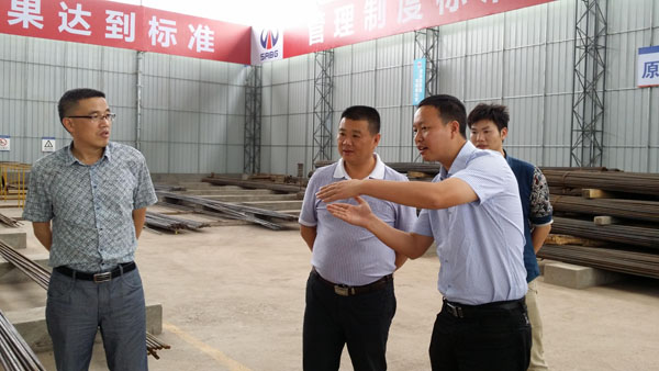 图为公司党委书记蒋德光(左二)认真听取支部委员、项目经理张捷介绍标准化钢筋加工场建设情况。