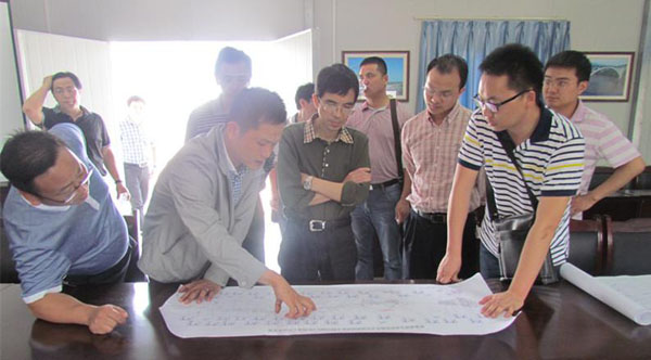谢副市长(前中)听取在四川路桥成贵铁路项目经理部党工委书记夏勇(前左二)汇报我部征拆推进情况。