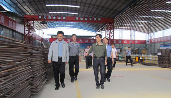 谢副市长(前右一)在四川路桥成贵铁路项目经理部党支部书记夏勇(前左一)陪同下参观一分部标准化钢筋加工场。
